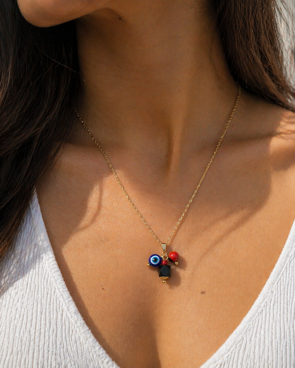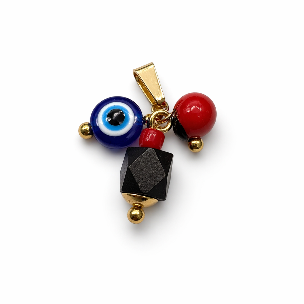 Este dije integra tres elementos ampliamente utilizados en distintas tradiciones espirituales. El azabache actúa como escudo frente a energías densas, el ojo turco se asocia con la protección contra el mal de ojo y el huayruro simboliza suerte y protección.
